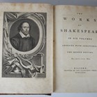 SHAKESPEARE, William. The Works of Shakespear. In Six Volumes. Adorned With Sculptures. Oxford: at the Clarendon Press, 1771-1770. 6 vols., second edition, 4to (321 x 234mm.) Half-titles, engraved frontispiece of the Chandos portrait, 38 engraved plates by H. Gravelt after F. Hayman, engraved tail-pieces, prefaces of Thomas Hanmer and Pope, a biographical account by Rowe, and Ben Jonson’s poem to vol. 1. (Toning, occasional scatted spotting, browning to plates.) Near contemporary half calf over marbled paper-covered boards, gilt titling to spines (rebacked, light surface rubbing). Note: ‘This reprint of Hanmer on excellent paper [is] perhaps the best-produced Shakespeare edition of the 18th century’ [Franklin, ‘Shakespeare Domesticated’, p. 31] (6).