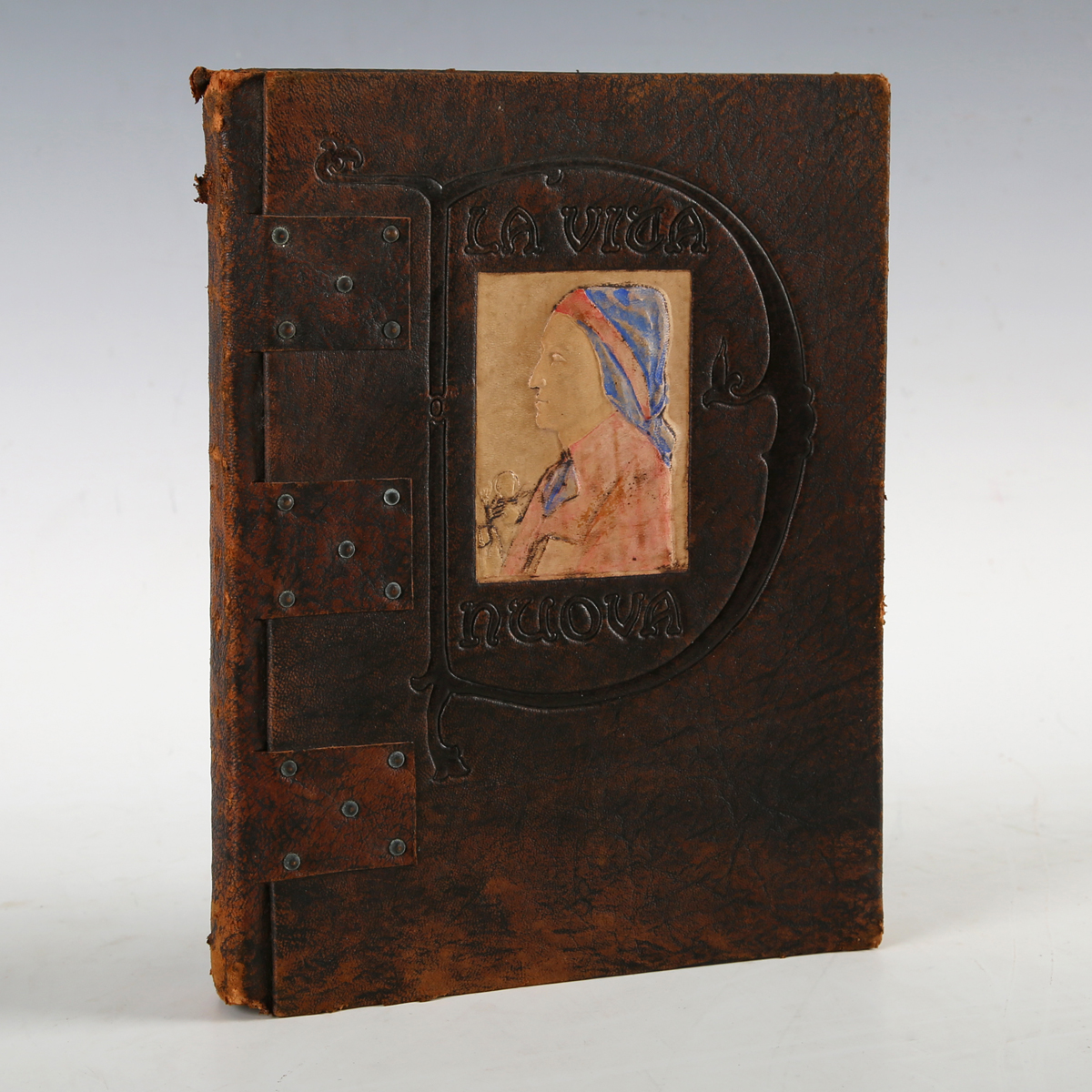 ALIGHIERI, Dante. La Vita Nuova. The New Life… translated by Dante Gabriel Rossetti. Coventry: Cheylesmore Press, [1915.] 4to (237 x 179mm.) Mounted colour illustrations by Evelyn Paul, colour decorations, music by Alfred Mercer. (Mild toning.) Original publisher’s full medieval style calf with mounted bas-relief of Dante to upper cover (extremities rubbed, some wear to spine ends).