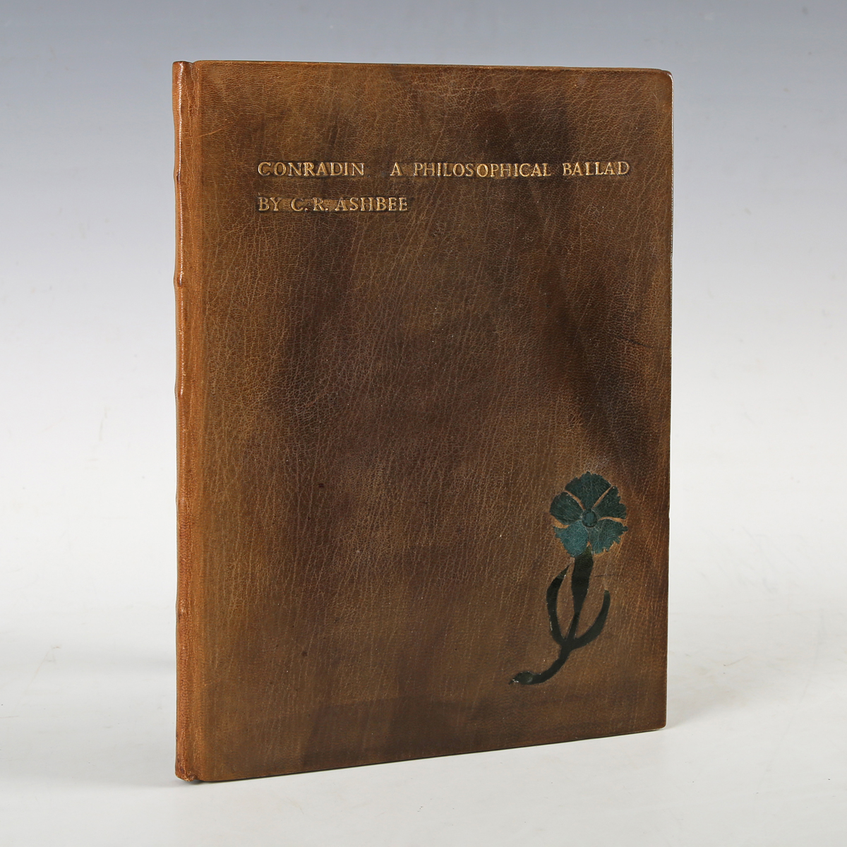 ASHBEE, C.R. The Conradin: A Philosophical Ballad. Gloucestershire, Broad Campden: Essex House Press, 1908. Limited edition, this being ‘out-of-series’, one of 250 copies only, 4to (253 x 194mm.) 6 full-page illustrations by P.A. Mairet. (Light marginal spotting to first leaves, spotting to rear three leaves, some marginal staining.) Contemporary brown morocco with floral green and black morocco onlays to upper cover (lightly sunned to spine, minor marks). Provenance: by descent from the family of C.R. Ashbee.