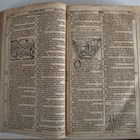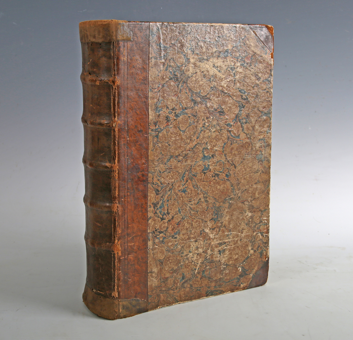 BIBLE, In German. [Biblia Das ist: Die gantze Heilige Schrifft. Frankfurt:] 1691. Signed in 6s (359 x 228mm.) Black letter, double-column, numerous woodcut illustrations in the text, separate titles with woodcut borders and vignettes for NT and Apocrypha, dated 1691. (Title bound-in dated 1662 and first leaves from this earlier date, OT and NT and Apocrypha from 1691, numerous paper repairs, title and last text leaf laid-down, marginal damp-staining throughout, browning.) 19th century half calf (heavily rubbed).