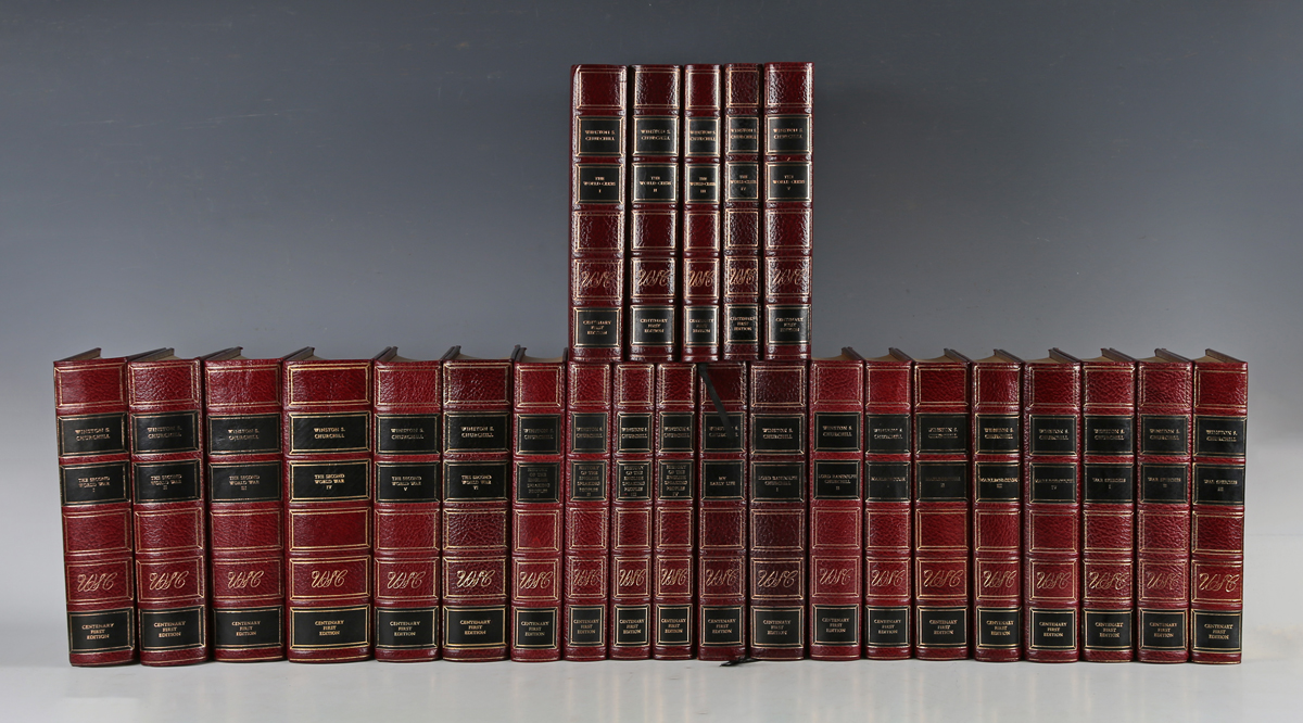 CHURCHILL, Winston. The Major Works of Winston Churchill. London: Diners Club, 1974. 25 vols., ‘Centenary’ edition, 8vo (228 x 139mm.) Photographic frontispieces. Original faux leather gilt, two black morocco labels to spines, g.e. (occasional scuff) (25).