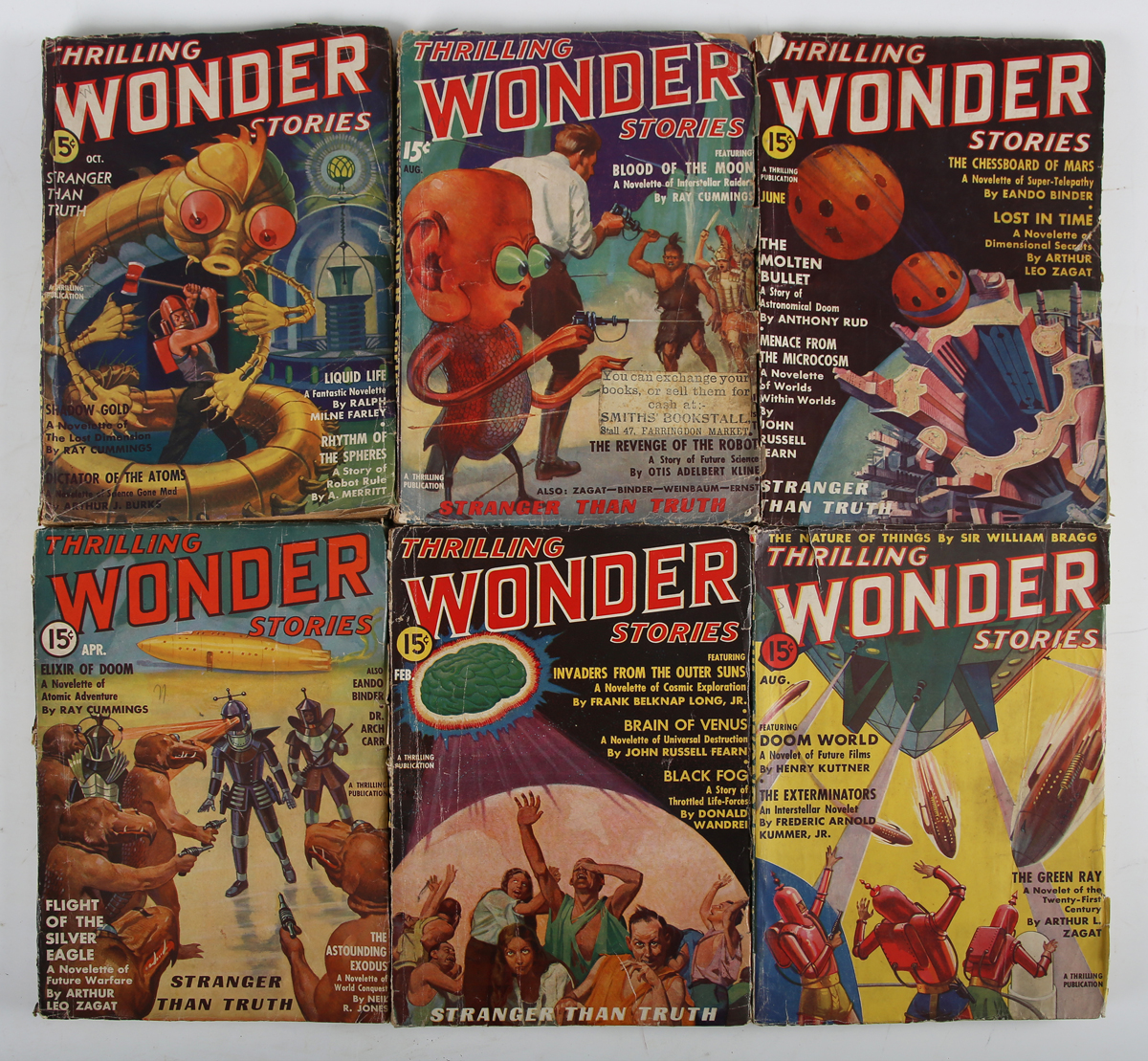 PULP SCIENCE FICTION. Thrilling Wonder Stories, the Magazine of Prophetic Fiction. New York: Beacon Magazines, Inc., October 1936-March 1953. 21 issues, 4to (248 x 173mm.) Numerous illustrations, advertisements. (Browning, creasing.) Original wrappers (creasing). Note: seven of these are the British edition from the 1950’s. – And a quantity of approximately 110 pulp science fiction magazines from 1938-2000, mostly 1980’s (a quantity).