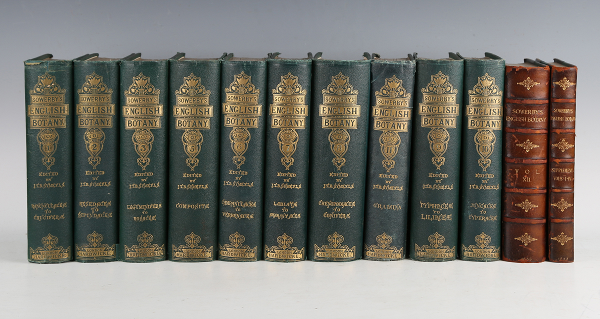 SOWERBY, John Edward. English Botany; or, Coloured Figures of British Plants… edited by John T. Boswell Syme. London: Robert Hardwicke, 1863-1892. 13 vols., including the ‘Supplement’, third edition, 8vo (251 x 163mm.) 1936 hand-coloured lithographed plates, some double-paged, including 12 hand-coloured and 2 uncoloured lithographed plates in the ‘Supplement’. (Toning, volumes 1-4 with light spotting on numerous leaves.) Original green blind-stamped cloth, gilt design to upper covers, t.e.g. (rebacked with original spines laid-down, endpapers replaced, lightly rubbed), vol. 12 and ‘Supplement’ in contemporary brown half morocco (sunned to spines). Provenance: Emily Watson (ink name on initial blanks); William Henry Mason (armorial bookplates to front pastedowns of vol.12 and ‘Supplement’) (13).