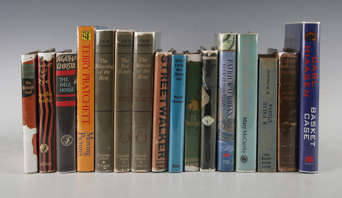 CHRISTIE, Agatha. Mrs. McGinty’s Dead. London: Collins for The Crime Club, 1952. First edition, 8vo (179 x 118mm.) 4pp. advertisements to rear. (Toning.) Original grey cloth (spine lean, sunned at top of spine panel), dust-jacket (loss to spine panel, extremities chipped). – And a further twenty-three volumes of 20th century fiction (including Agatha Christie’s ‘A Pocket Full of Rye’, first edition, 1953, 8vo, and ‘The Pale Horse’, first edition, 1961, 8vo, and Terry Pratchett’s ‘Moving Pictures’, first edition, 1990, 8vo, and J.R.R. Tolkien’s ‘Lord of the Rings’, 3 vols., 1966-1971, 8vo, and Aldous Huxley’s ‘After Many a Summer’, first edition, 1939, 8vo, and Bernard Cornwell’s ‘Harlequin’, signed by the author, 2000, 8vo, and Cornwell’s ‘Sharpe’s Fortress’, signed by the author, 1999, 8vo, and Dick Francis’ ‘The Danger’, signed by the author, 1983, 8vo, and Eoin Colfer’s ‘Artemis Fowl’, signed by the author, 2001, 8vo ) (24).