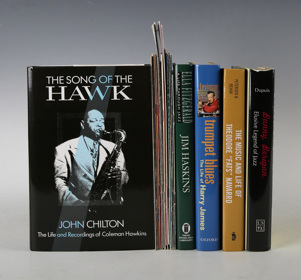 JAZZ. – John CHILTON. The Song of the Hawk, the Life and Recordings of Coleman Hawkins. London: Quartet Books, 1990. First edition, 8vo (232 x 146mm.) Photographic illustrations. (Mild toning.) Original black cloth, dust-jacket. – And a quantity of approximately eighty further volumes related to jazz (including eighteen souvenir brochures, circa 1960’s-1980’s) (a quantity).