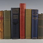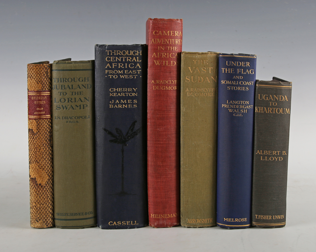 BINDING. – Cullen GOULDSBURY. Rhodesian Rhymes. Bulawayo: Philpott & Collins, 1932. First edition, 8vo (213 x 134mm.) (Toning, pencil marks to rear pastedown, occasional spotting.) Contemporary half snake-skin over green cloth, red morocco lettering piece to the spine (faint stain to upper cover). – And a further thirty-six volumes relating to Africa (including I.N. Dracopoli’s ‘Through Jubaland to the Lorian Swamp’, 1914, 8vo, and Cherry Kearton and James Barnes’ ‘Through Central Africa from East to West’, 1915, 8vo) (37).