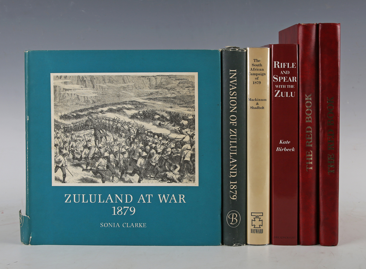 CLARKE, Sonia. Zululand at War. South Africa, Houghton: The Brenthurst Press, 1984. Limited edition, this being one of 1000 copies, 8vo (263 x 252mm.) Numerous illustrations. (Mild toning.) Original blue cloth, dust-jacket (tear at base of spine, lightly rubbed). – And a further twelve volumes related to the Zulu War (including Sonia Clarke’s ‘Invasion of Zululand’, 1979, 8vo, and Kate Birbeck’s ‘Rifle and Spear with the Zulu’, signed by the author, 2018, 8vo, and J.P. Mackinnon and S.H. Shadbolt’s ‘The South African Campaign of 1879’, 1973, 8vo) (13).