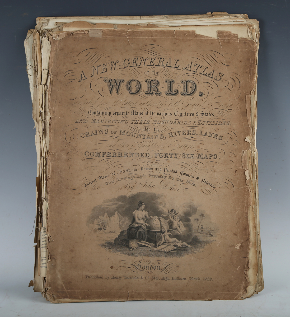 DOWER, John. A New General Atlas of the World, Compiled from the latest authorities both English & Foreign, Containing Separate Maps of its various Countries & States. London: Henry Teesdale & Co., March 1832. Folio (476 x 366mm.) Contents leaf, 45 hand-coloured copper-engraved maps drawn and engraved by John Dower, including 1 double-paged ‘India’ map. (Disbound, lacking last map, stitched repair to ‘Western Hemisphere’ map, large tear to ‘Turkey’, tear to crease of ‘India’ and large marginal loss and marginal losses and chipping to most maps, some browning and dust-soiling.) Original card wrapper (lacking lower wrapper, heavily chipped extremities).