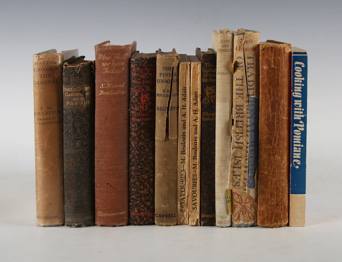 COOKERY. – X. Marcel BOULESTIN. Having Crossed the Channel… London: Heinemann Ltd., 1934. First edition, 8vo (183 x 114mm.) Colour frontispiece, illustrations by J.E. Laboureur, errata leaf. (Mild toning, pencil notes to rear endpaper.) Original brown cloth, dust-jacket (chipping and creasing to spine ends). Note: Boulestin popularised French cookery for English audiences and was an influence on Elizabeth David. – And a further eleven books relating to cookery (including a first printing of Boulestin’s ‘What Shall We Have To-day?’, 1931, 8vo and R.E. Anderson’s ‘Gastronomy As a Fine Art, or, The Science of Good Living’, 1877, 8vo, and Edouard de Pomiane’s ‘Good Fare, A Code of Cookery’, 1932, 8vo) (12).