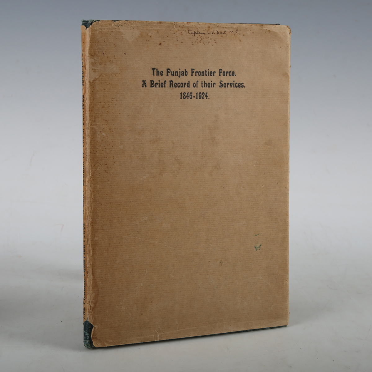 INDIA. – R. NORTH. The Punjab Frontier Force. A Brief Record of Their Services 1846-1924. Dera Ismail Khan: Commercial Steam Press, 1934. 4to (253 x 180mm.) Folding map of North West Frontier to rear pocket. (Toning.) Original green cloth (spotting to edges), dust-jacket (chipping to extremities, some loss at base of spine, minor spotting). Note: scarce. The Punjab Frontier Force was initially known as the ‘Punjab Irregular Force’ and was created to protect the newly acquired frontier with Pakistan. It was known as ‘Irregular’ because it was outside the control of the East India Company’s army and reported instead to the Chief Commissioner of the Punjab. Provenance: Captain L.V. Dart (ink name to upper panel of dust-jacket).