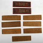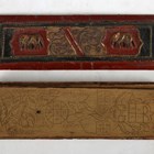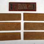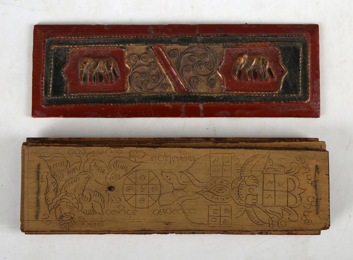 PALM LEAF MANUSCRIPT. [Seven leaves of a Burmese Buddhist text in Pali script with ink illustrations. N.p.: circa 1900.] 7 leaves, manuscript, oblong loose-leaf (53 x 202mm.) Ink illustrations with Pali script surround recto and verso on palm leaves. Original painted wood covers, disbound (slight chipping).
