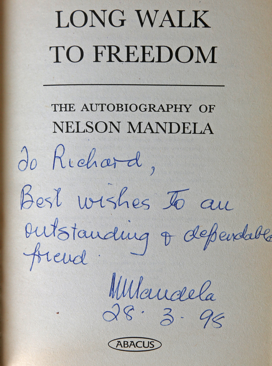 SIGNED BOOK. – Nelson MANDELA. Long Walk to Freedom. London: Abacus, 1997. Signed and inscribed by Nelson Mandela, 8vo (198 x 123mm.) Photographic illustrations, loosely inserted ‘Breakfast with Frost’ card. (Mild toning.) Original card covers (slightly rubbed at extremities). Note: the inscription reads: ‘To Richard, Best wishes to an outstanding and dependable friend, Mandela, 28.3.98’. Richard Brock worked as Deputy Editor on David Frost’s B.B.C. programme ‘Breakfast with Frost’. Having heard that Mandela might be available for an interview if his charity was recognised then Richard set to work to facilitate the interview. It was broadcast from the deck of the QEII in Durban harbour and the warmth of the inscription reflects Mandela’s appreciation of the efforts that had gone into making the arrangements. Provenance: Richard Brock, B.B.C. Producer (gift inscribed by author).