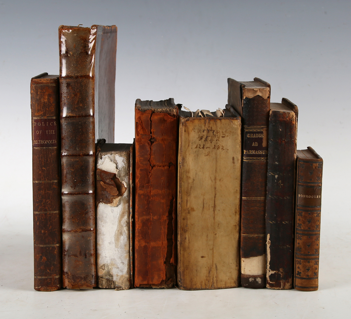 [COLQUHOUN, Patrick.] A Treatise on the Police of the Metropolis, Explaining the Various Crimes and Misdemeanours Which at Present are Felt as a Pressure Upon the Community. London: H. Fry for C. Dilly, 1796. First edition, 8vo (209 x 126mm.) Title, 1 folding table. (Occasional browning, lacking half-title.) Contemporary marbled calf, red morocco lettering piece to the spine (minor scuffing, joints splitting at head of spine). Note: a scarce first printing of Colquhoun’s work on policing. In 1798, along with Jeremy Bentham, Colquhoun devised a method of utilitarian preventative policing when he established the Marine Police Force on the River Thames. – And a further seven volumes (including ‘Certain Sermons or Homilies Appointed to be Read in Churches at the time of Queen Elizabeth of famous Memory…’, [title with loss], 1635, folio, and a Bible in Greek, [circa 1684], 12mo) (8).