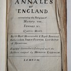 GODWIN, Francis, Bishop. Annales of England containing the Reignes of Henry VIII, Edward VI, Queen Mary…[translated] by Morgan Godwin. [London: I. Islip and W. Stansby], 1630. First English edition, 4to (268 x 175mm.) Title in manuscript, woodcut initials and headpieces. (Lacking woodcut titles and engraved portraits, marginal creasing to first and last leaves, L2 with marginal corner loss, X2-Ff2 with marginal insect damage, Uu1-Uu3 with tears.) Contemporary calf (wear with some loss to spine ends, insect damage to upper cover, rubbed). Note: first published in Latin in 1616. Provenance: Bowler (ink name to initial blank).