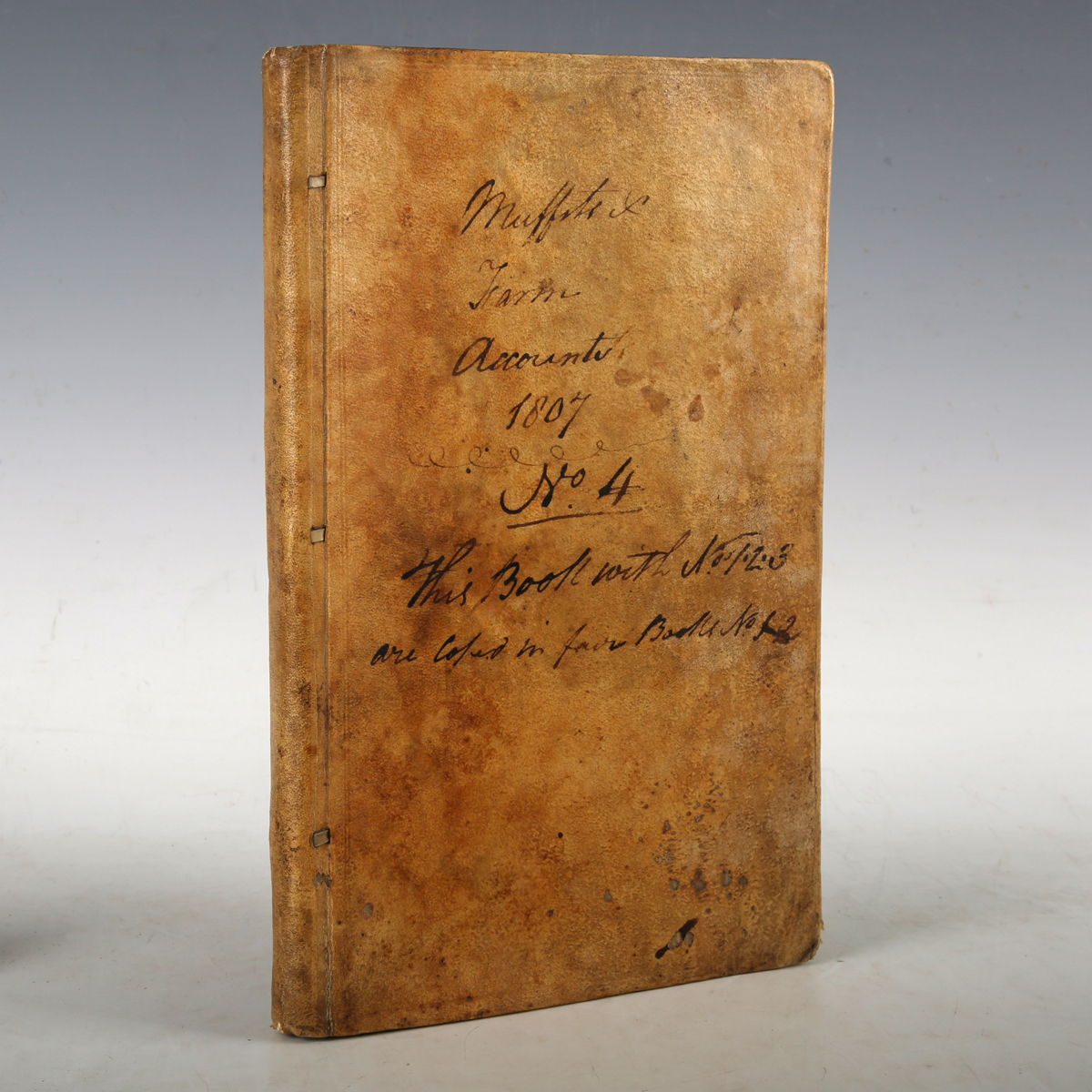 MANUSCRIPT. [An account book for ‘Muffets’ Farm. N.p.:] 1807-1809. 118pp., manuscript, tall 4to (314 x 194mm.) 118pp. hand-written entries in a single legible hand, comprising expenditure on goods and services, but mostly wages with weekly totals, 26pp. blank. (Toning, finger-marked, some chipping.) Contemporary vellum, manuscript lettering to upper cover (discoloured and stained). Note: there are typical farm expenses (‘four loads of stones’), and several regular employees (‘Paid Franklin for Binding’). In the summer months the employee list doubles in length, often including female relatives of the employees.