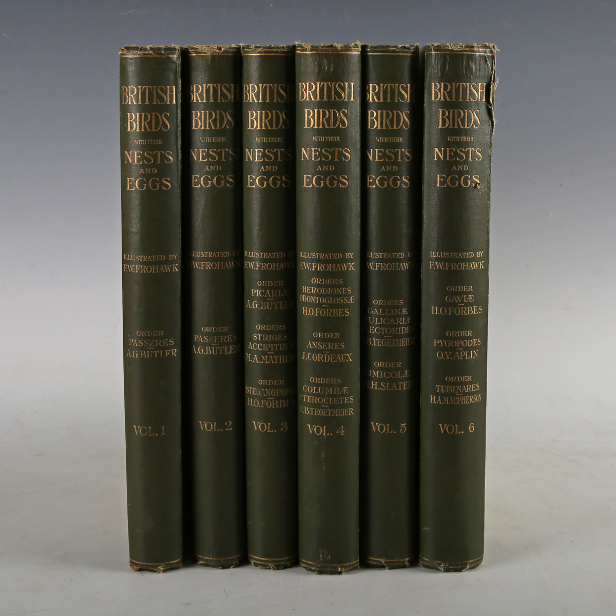 BUTLER, Arthur G. and F.W. FROHAWK (illustrator). British Birds With Their Nests and Their Eggs. London: Brumby & Clarke Limited, [n.d. but 1896-1898.] 6 vols., 4to (316 x 250mm.) 24 chromolithographed plates by Frohawk, tissue-guards, numerous black and white plates. (Toning, 5 chromolithographed plates with light spotting, light to moderate spotting within text.) Original cloth, gilt lettering to upper cover and spines (extremities bumped, wear to joints of vol. 6, some finger-marking, dis-colouring to lower cover of vol. 1). Provenance: Henry C. Maude (ink name to front-free endpapers); Emily Fitzwalten (gift inscribed from on front pastedown of vol. 1) (6).