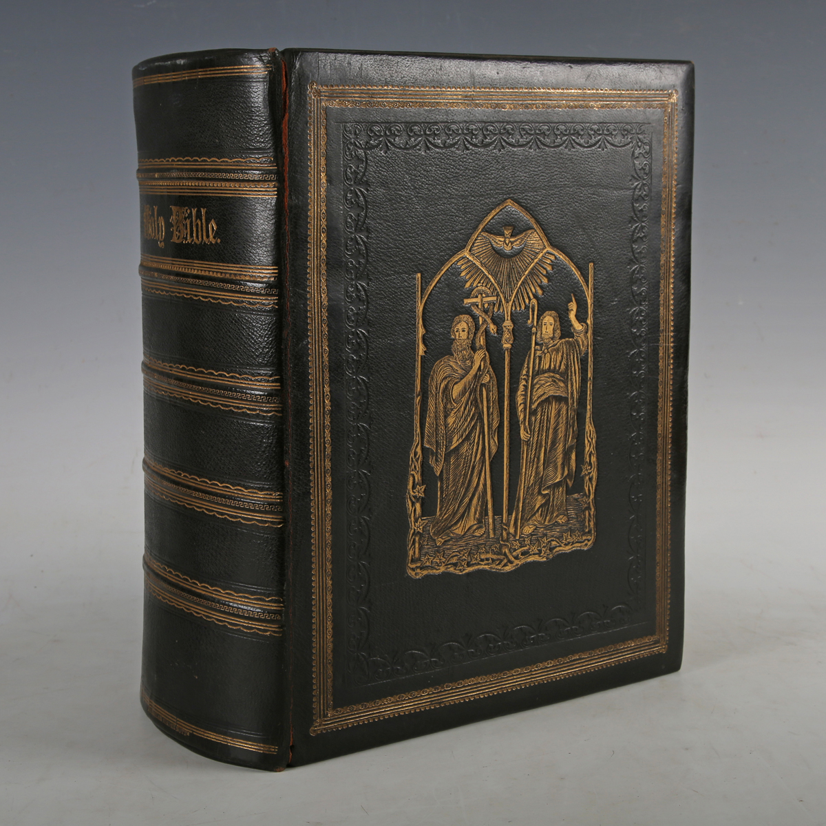 BIBLE, In English. The Illustrated Family Bible: Being the Old and New Testaments… to which are added original notes by John Kitto… and Rev. Canon Birks. London: James Sangster and Company, [n.d. circa 1872]. 4to (311 x 241mm.) Numerous engraved plates, some chromolithographed, wood-engraved illustrations. (Light scattered spotting.) Original blind-stamped and pictorial gilt, g.e.