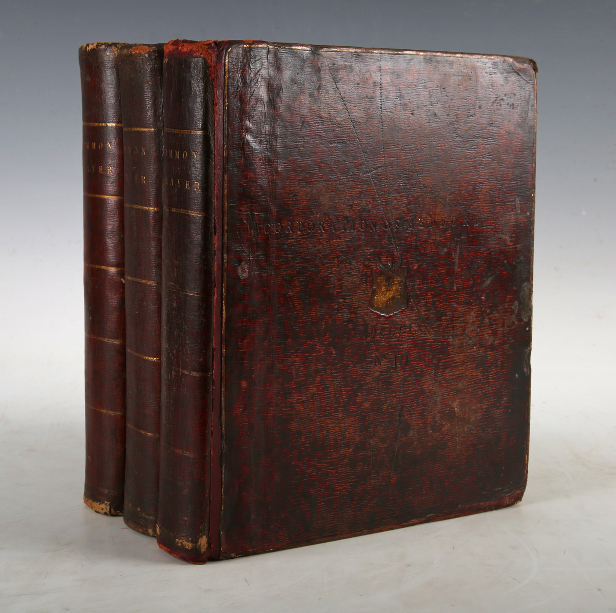 COMMON PRAYER, In English. The Book of Common Prayer, and Administration of the Sacraments, and Other Rites and Ceremonies of the Church. Oxford: at the Clarendon Press, by Dawson, Bensley, and Cooke, 1806. Title. (Crease and marginal spotting to title.) [Bound with:] A New Version of the Psalms of David. London: for the Company of Stationers, 1807. (Toning.) 4to (288 x 220mm.) Contemporary red morocco, g.e. (extremities rubbed, some fading and discolouring, minor scuffing). Provenance: Corporation of Bedford (gilt to upper cover). – And a further thirty-three volumes (including a further two copies of the ‘Common Prayer’, 1806, 4to, and Charles Darwin’s ‘The Descent of Man’, vol. 1 [of 2], 1871, 8vo, and ‘The Henry Irving Shakespeare’, 8 vols., 1898, 8vo) (34).