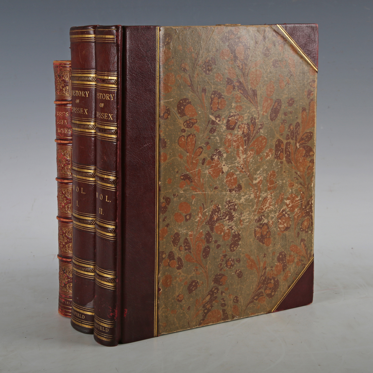 NIBBS, R.H. The Churches of Sussex (First Series). Brighton: R.H. Nibbs, 1851. First edition, 4to (274 x 210mm.) Title in red and blue, etched frontispiece and 83 etched plates. (Light to moderate spotting to plate margins, browning to text leaves, stamps and labels verso title.) Near contemporary red full morocco by Hayday, g.e. (extremities rubbed, some scuffing to joints). Provenance: Sussex County Council Library (labels to front pastedown). – And a further eight volumes related to Sussex (including T.W. Horsfield’s ‘The History, Antiquities, and Topography of the County of Sussex’, 2 vols., 1835, 4to, and R. Willis’ ‘The Architectural History of Chichester Cathedral’, 1861, 4to) (9).