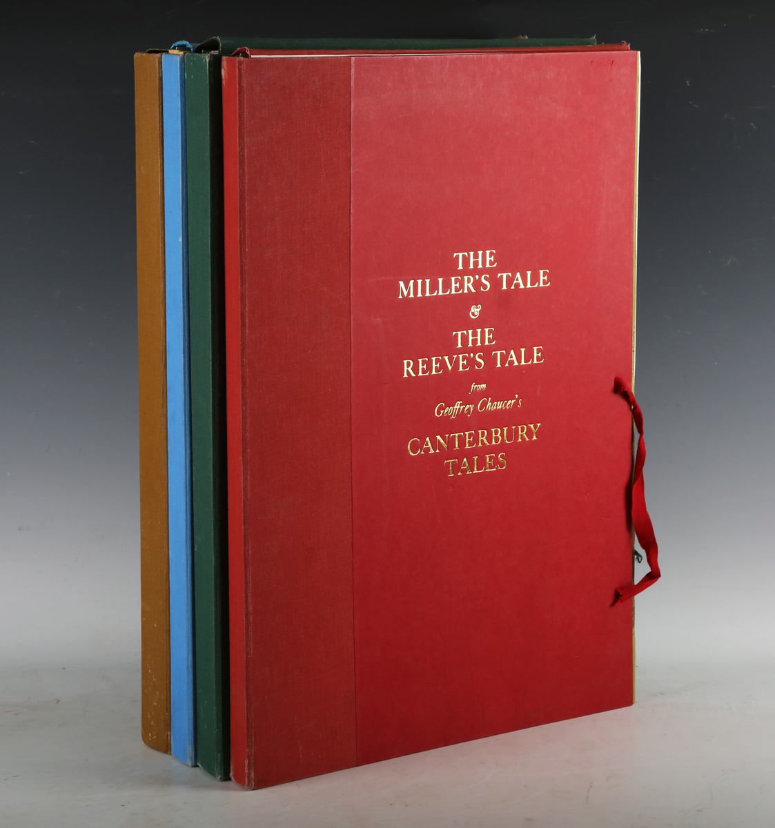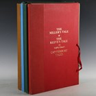 CHAUCER, Geoffrey. – Charles MOZLEY (illustrator). The Canterbury Tales, translated by Nevill Coghill. [N.p: n.d. but 1985-1986.] 8 parts in 4 vols., elephant folio (588 x 413mm.) Numerous tinted and black and white lithographed plates by Charles Mozley. Unstitched as issued within pictorial card wrappers, contained within four cloth portfolios with ties (some creasing to inner flaps of one volume, minor scuffing). Note: includes ‘The Prologue’ and ‘The Wife of Bath’s Tale’, ‘The Summoner’s Tale’ and ‘The Clerk’s Tale’, ‘The Merchant’s Tale’ and ‘The Shipman’s Tale’, ‘The Miller’s Tale’ and ‘The Reeve’s Tale’ (4).