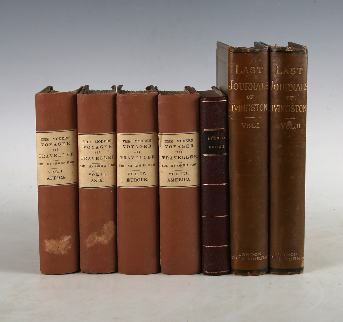 ADAMS, William. The Modern Voyager and Traveller, Through Europe, Asia, Africa, & America. London: for Fisher, Son & Co., 1830-1831. 4 vols., small 8vo (169 x 99mm.) 4 additional hand-coloured vignettes to titles, 48 engraved plates including 43 hand-coloured, 3 folding maps. (Occasional browning, spotting to 3 plates in vol. 4 and 2 in vol. 1 and preliminaries of vol. 2, toning, pencil collation to pastedown of vol. 1.) Later cloth-backed original boards, paper labels to spines (rebacked, extremities rubbed, staining to spines of two volumes). – And a further ten volumes (including [Elizabeth Melville’s] ‘A Residence at Sierra Leone’, 1849, 8vo, and ‘The Last Journals of David Livingstone’, 2 vols., 1880, 8vo, and Henry M. Stanley’s ‘Through the Dark Continent’, 2 vols., 1878, 8vo) (14).