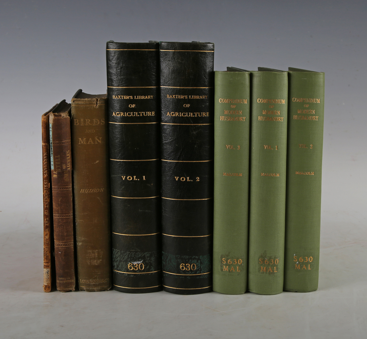 MARKHAM, Gervase. The Inrichment of the Weald of Kent: or, a Direction to the Husband-man, for the true ordering, manuring, and inriching of all the Grounds within the Wealds of Kent and Sussex. London: Nicholas Okes for John Harison, 1631. Small 4to (183 x 134mm.) Engraved printer’s device to title, engraved headpiece and initial. (Stamps to title and verso.) Early 20th century half calf, gilt lettering to spine (old paper label to spine, heavily rubbed extremities). – And a further seven related volumes (including Gideon Mantell’s ‘Thoughts on Animalcules’, 1846, 8vo, and W.H. Hudson’s ‘Birds and Man’, with a 4pp. tipped-in letter from the author, 1901, 8vo, and ‘Baxter’s Library of Practical Agriculture’, 2 vols., 1846, 8vo) (8).