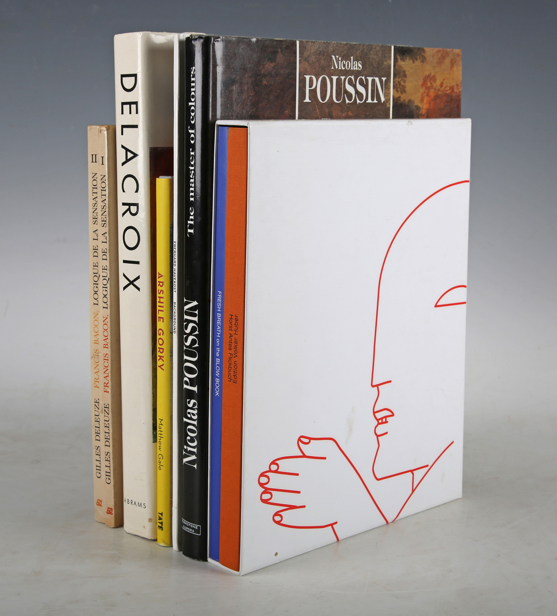 ART REFERENCE. – Gilles DELEUZE. Francis Bacon Logique de la Sensation. [Paris:] Editions de la Différence, 1981. 2 vols., first edition, 8vo (271 x 198mm.) Photographic illustrations. (Toning.) Original card covers (toned). Note: Deleuze’s analyses Bacon’s art in terms of the idea of ‘becoming’ that he had formulated in his book with Félix Guattari ‘A Thousand Platteaus’, published the year previously. – And a further thirty-six volumes of art reference (including Horst Antes’ [Blow Book] ‘FlickBuch and Fresh Breath on the Blow Book’, 2 vols., 2000, 4to, and Maurice Sérullaz’s ‘Eugène Delacroix’, [1990], 4to, and Eberhard Havekost’s ‘Background’, 2007, 4to) (38).