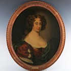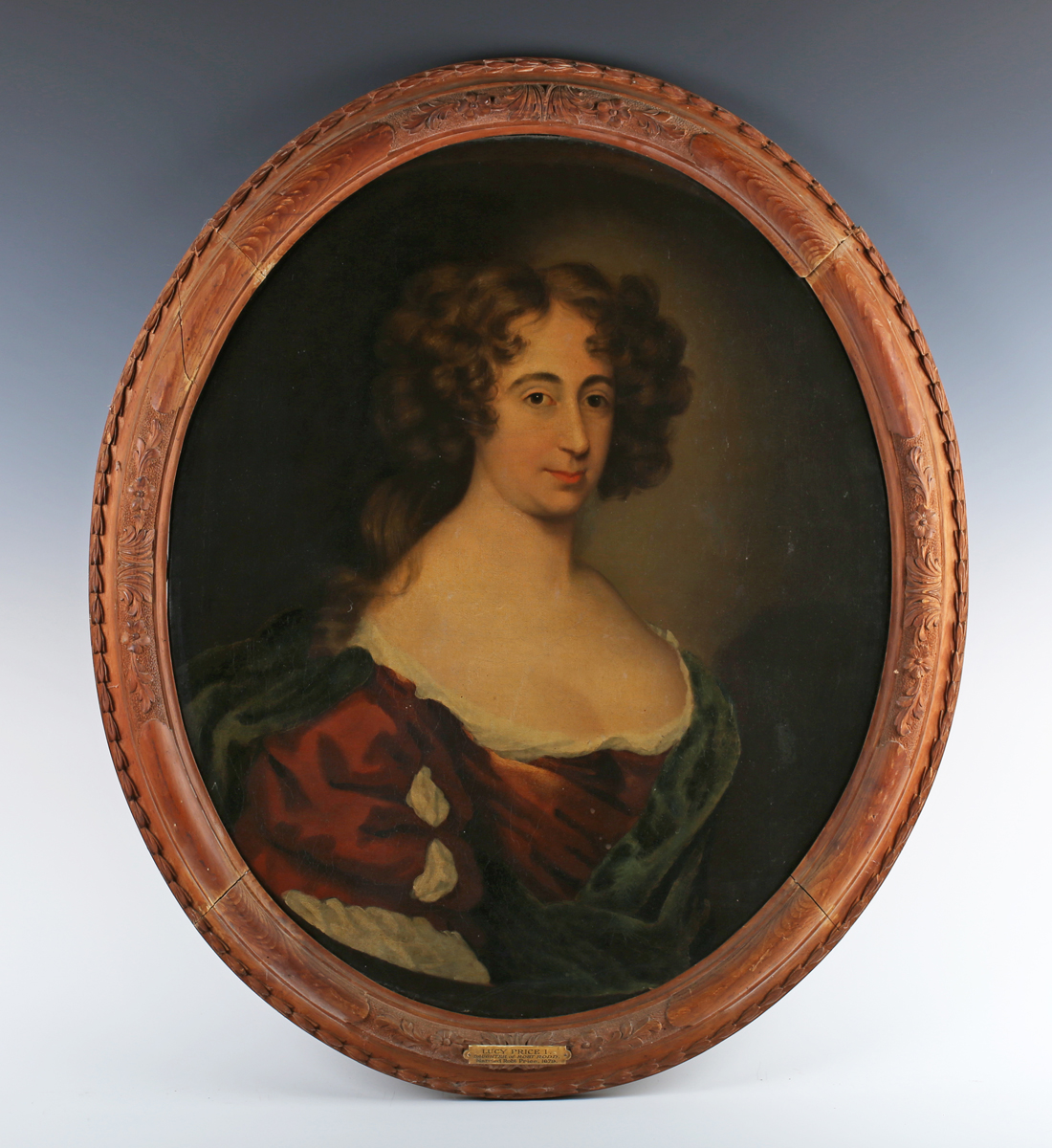 Manner of Sir Peter Lely (Dutch 1618-1680) - Head and shoulders portrait of 'Lucy Price I, Daughter of Robt. Rodd, Married Robt. Price, 1679', oil on canvas, oval, within a carved frame.