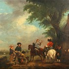 Manner of Philips Wouwerman (Dutch 1619-1668) - Hawking party taking refreshments beside an inn, with rustics in attendance, oil on canvas, 71cm x 91cm, within a gilt frame.