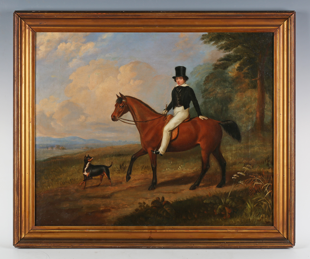Circle of John Ferneley - Frederick Bateman on horseback in a landscape, oil on canvas, inscribed on label verso 'Frederick Bateman the youngest of nine and seventh son of Colthurst Bateman of Bertholey House, County of Monmouth', 48.5cm x 59cm, within a gilt composition frame. Note: in the dunes of Condette, near Hardelot, Northern France, there is an obelisk to commemorate Frederick Bateman, who died on that spot aged 22 in October 1847, after an accidental discharge of his rifle.
