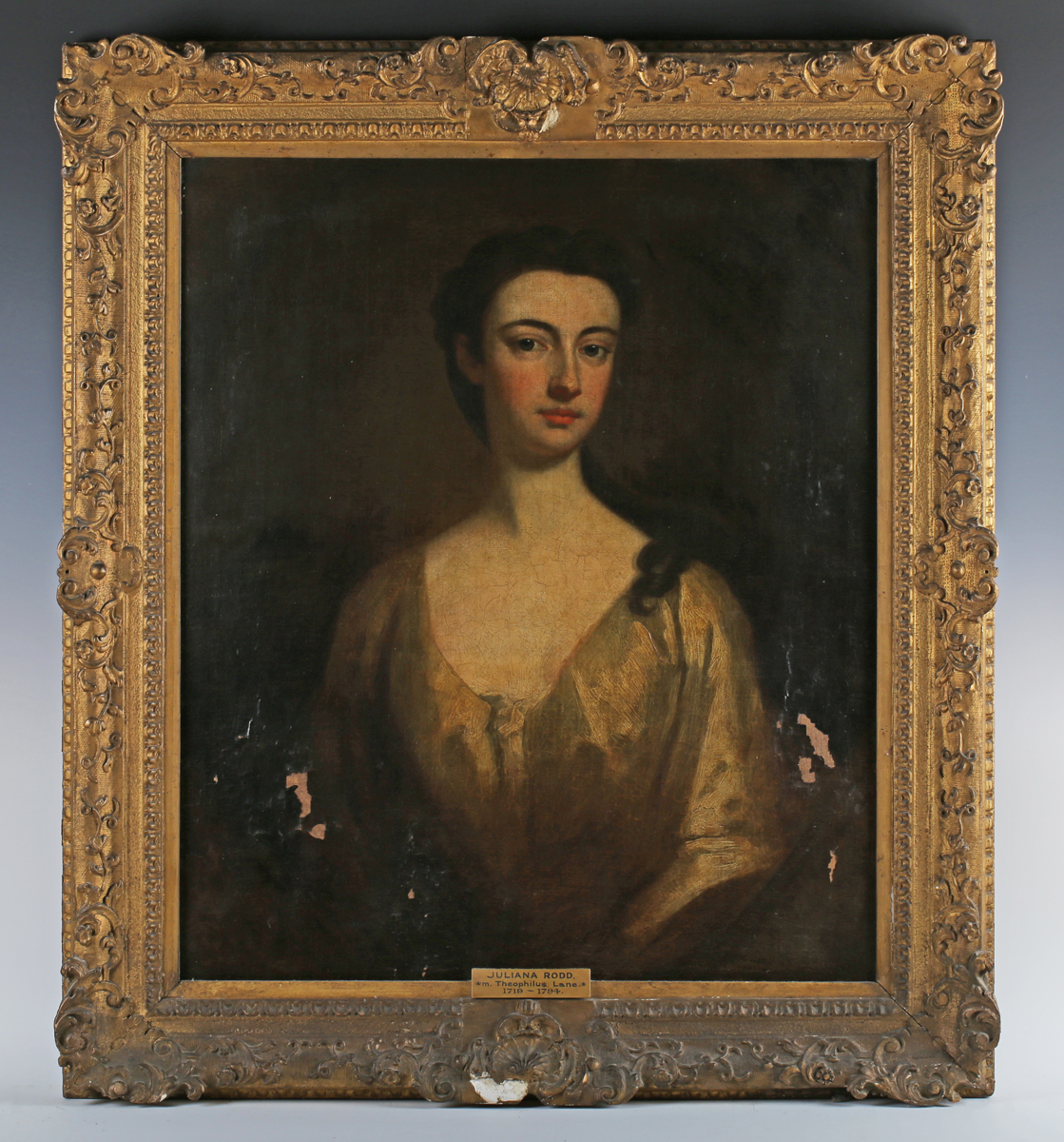 Manner of Michael Dahl (1656-1743) - Head and shoulders portrait of 'Juliana Rodd, m. Theophilius Lane, 1719-1794', oil on canvas, inscribed to label verso 'Juliana Rodd of Rodd, Daughter of Bampfylde Rodd II...', 76cm x 63cm, within a gilt composition frame (paint losses).
