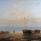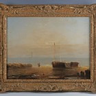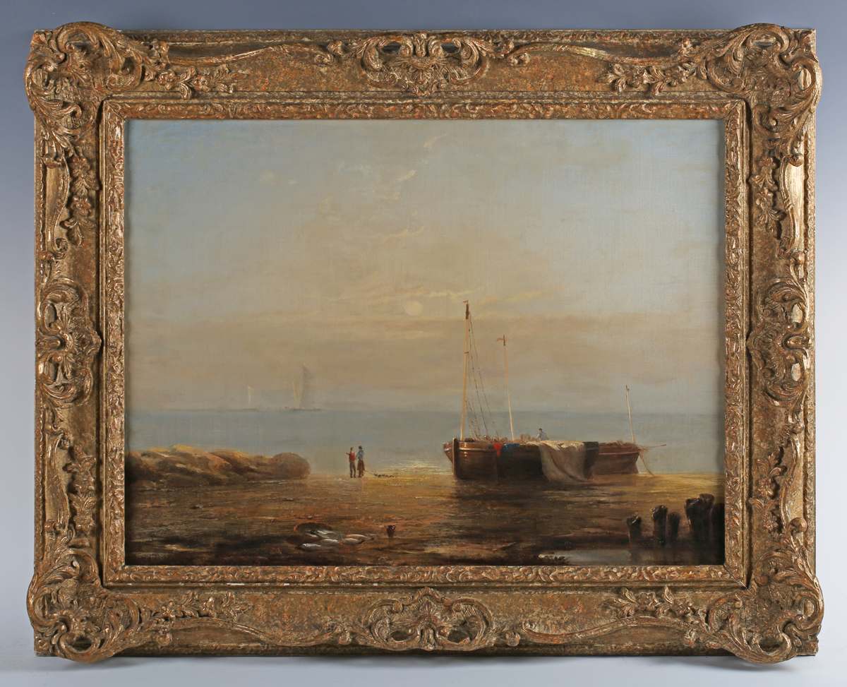 British School (19th century) - Beach scene with figures and beached boats, oil on canvas, 46cm x 61cm, within a swept gilt composition frame.