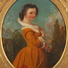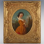 J. Walker (British 19th century) - Three-quarter-length profile portrait of a young lady in Elizabethan costume, oil on canvas, 44cm x 34cm, within a swept gilt composition frame with oval aperture.