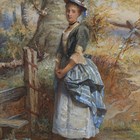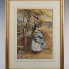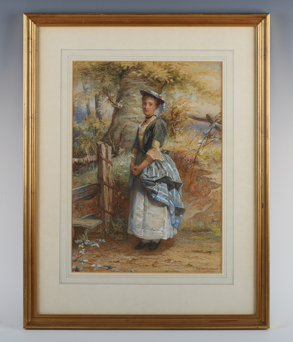 William Harris Weatherhead (British 1843-1903) - All Dressed Up: country girl by a stile in a landscape, watercolour, signed and dated 1877 lower right, 37.5cm x 26.5cm, within a gilt frame.
