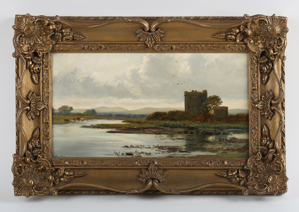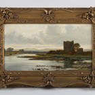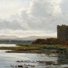 William Beattie Brown (Scottish 1831-1909) - 'Thrieve Castle, Dumfriesshire', oil on board, signed lower left, signed, inscribed and dated 1876 on label verso, 17.5cm x 30cm, within a swept gilt composition frame.