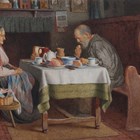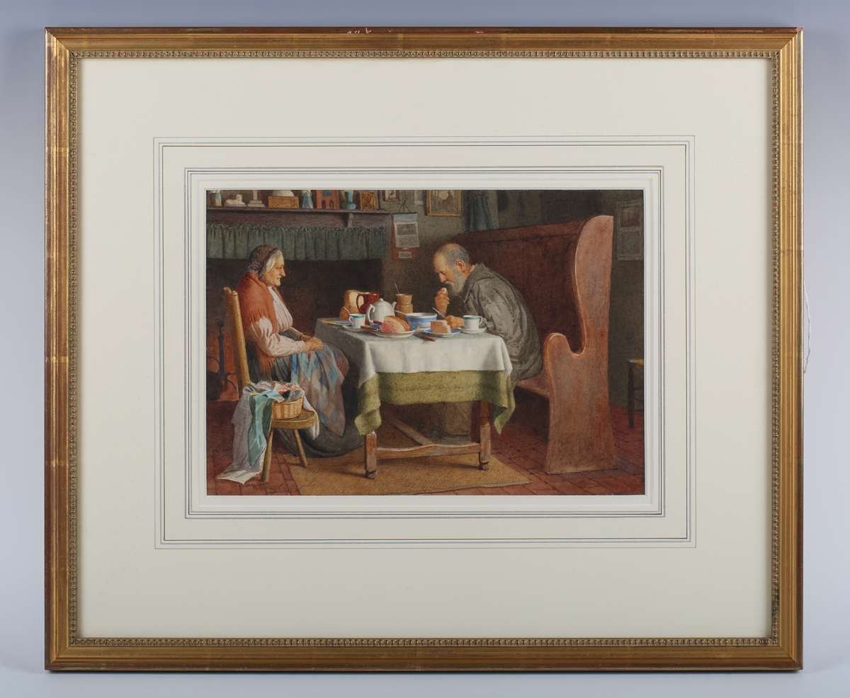 Henry Edward Spernon Tozer (British 1864-1955) - 'The Evening Meal': elderly couple eating at a table before the fire, watercolour, signed and dated 1920 lower left, 23cm x 32,5cm, within a gilt frame.