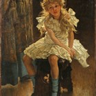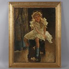 Attributed to Jacques-Émile Blanche (French 1861-1942) - Full-length portrait of Marie Blanche, as a child, seated in an interior on a pierced gothic design stool, wearing an ivory silk dress with layered lace collar, blue socks and black patent shoes, oil on canvas, 123cm x 93cm, within a reeded gilt frame. Provenance: purchased by the Swedish grandparents of the vendor when they married in Paris in 1910. It is believed the portrait was purchased directly from the artist and is of Blanche’s daughter Marie. The vendor’s ancestors were founders of a large timber mill industry in Sweden.
