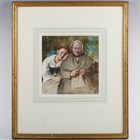 William Lee Hankey (British 1869-1952) - 'Knitting': young girl with old woman knitting, watercolour, signed and 1914 lower right, inscribed to label verso, 20.5cm x 20cm, within a gilded oak frame.