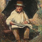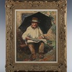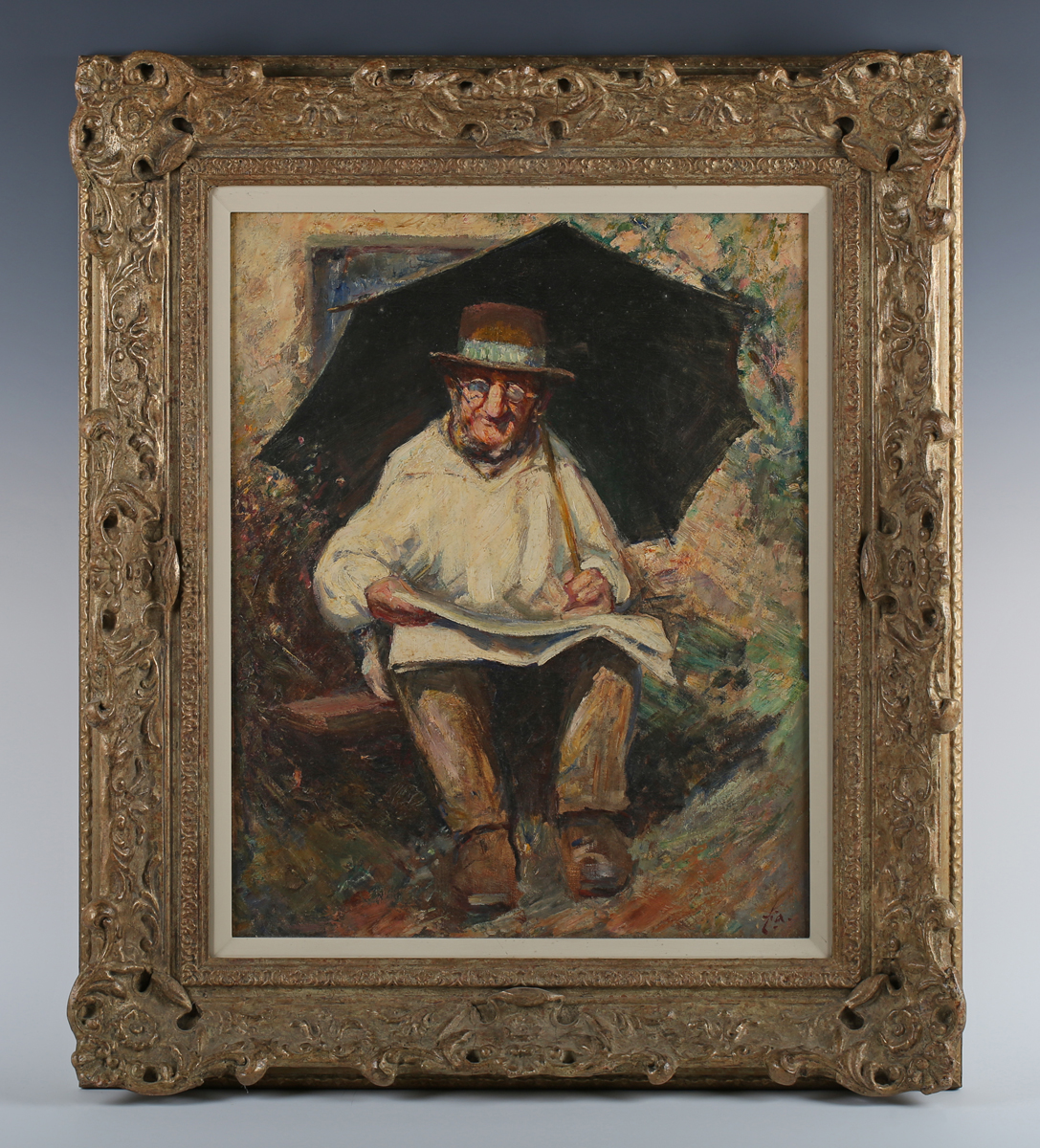 Harry Fidler (British 1856-1935) - Elderly gentleman reading under an umbrella in the garden (probably Gideon Fidler, the artist’s brother), oil on canvas, signed lower right, 51cm x 41cm, within a swept composition frame.