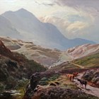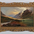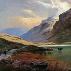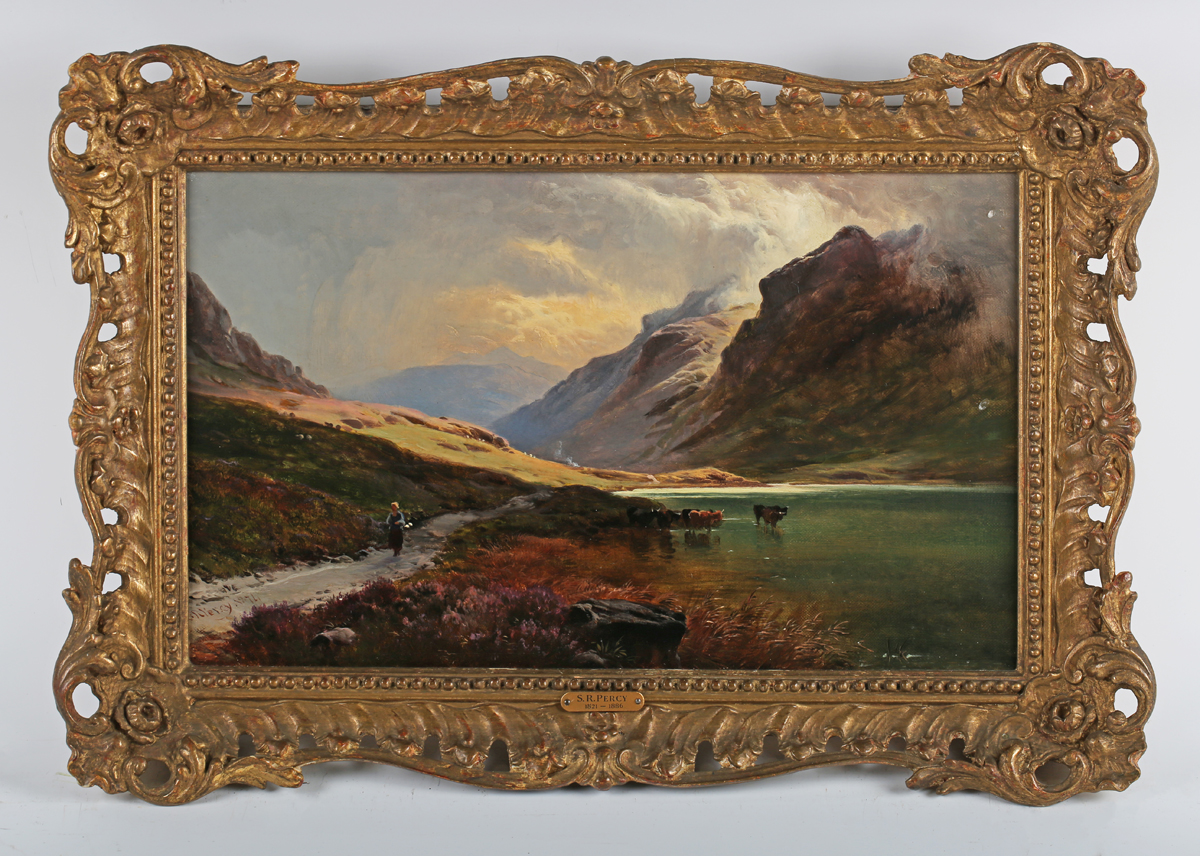 Sidney Richard Percy (British 1821-1886) - Loch scene with cattle watering; Cattle and girl on a mountain pass, a pair, oil on canvas, both signed and dated 1874, one lower right, one lower left, each 23cm x 38cm, in swept and pierced gilt composition frames (2).