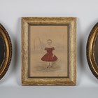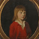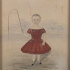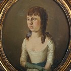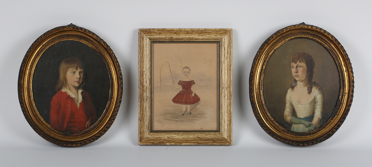 British School (late 18th century) - Half-length portrait of a young lady; Half-length portrait of a boy, identified as ‘Jane Newcomb, daughter of Ch. Newcomb of Coventry & Stoke’ and ‘John Newcomb…’, a pair, oil on panel, oval, each 19cm x 15.5cm, both within a pressed metal frames, together with a watercolour portrait of a child holding a whip, attributed to George Smith (3).