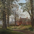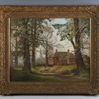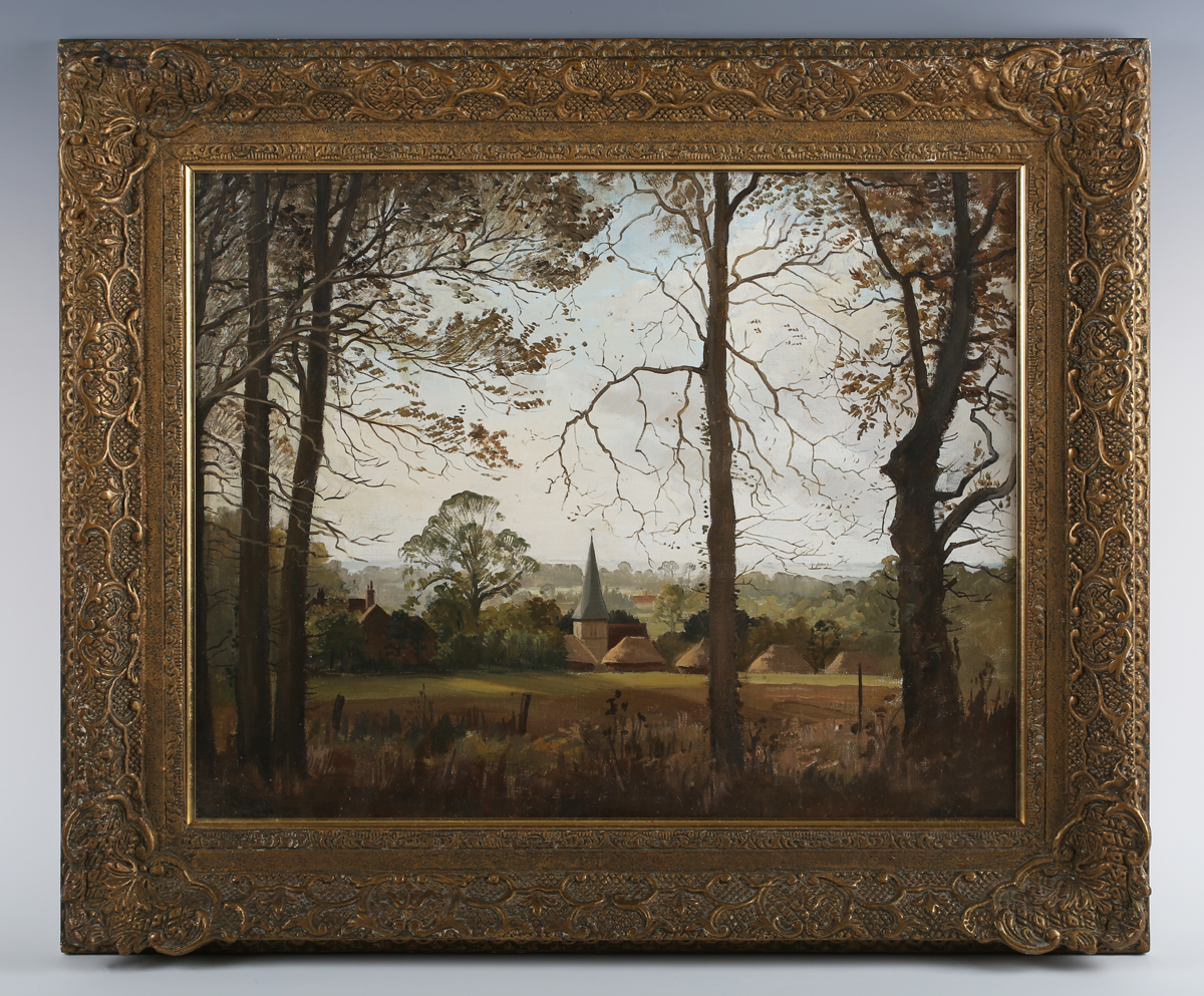 Doris H. de Carteret (British 1897-1956) - Rural wooded landscape with red brick house and church beyond; Wooded landscape with church, house and haystacks, a pair, oil on board, both signed, the first lower left, the second lower right, each 38cm x 48cm, within gilt composition frames of moulded section (2).