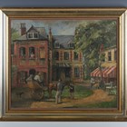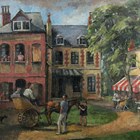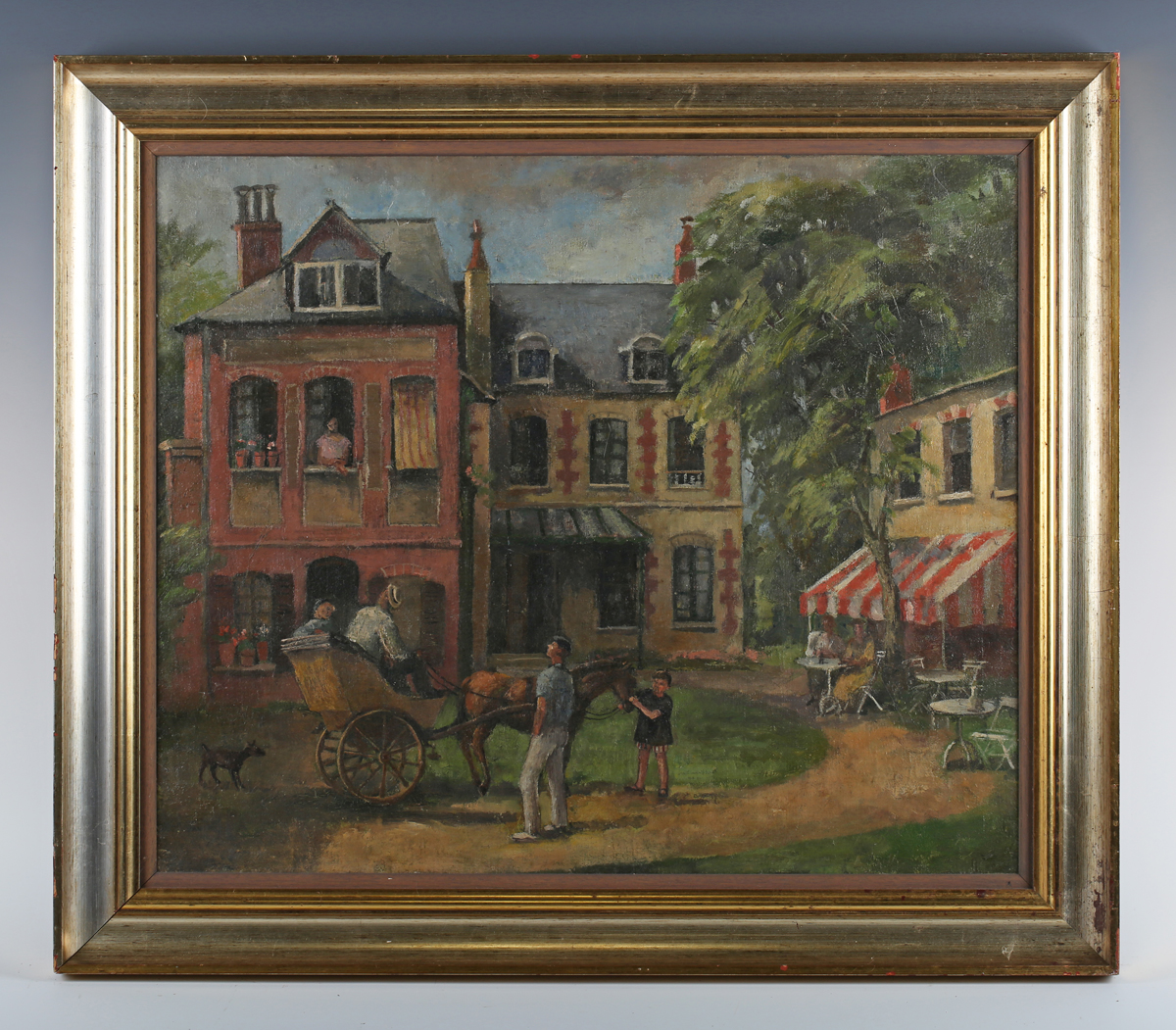 Circle of Edward Ardizzone (British 1900-1979) - Figures with horse and cart in a French town square, oil on canvas, 51cm x 61cm, within a silvered gilt frame.