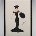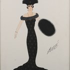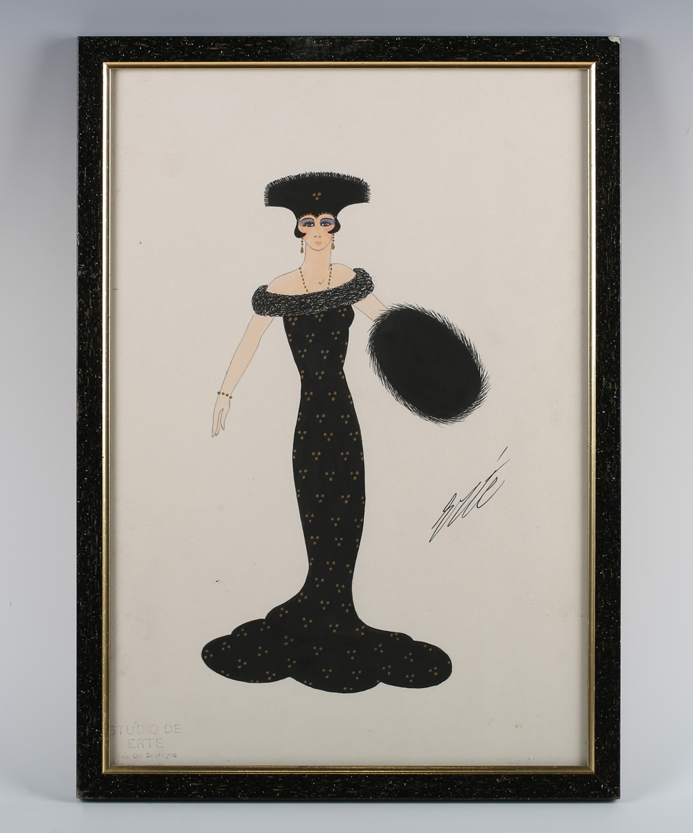 Erté (Romain de Tirtoff, Russian/French 1892-1990) - Elegant lady in black with a fur muff, pen, ink and gouache, heightened with gold pen, signed lower right, atelier stamp lower left, 42cm x 28.5cm, within a black frame.