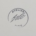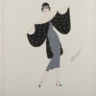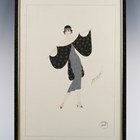Erté (Romain de Tirtoff, Russian/French 1892-1990) - Elegant lady in a grey and black gown, pen, ink and gouache, heightened with gold pen, signed middle right, atelier stamp lower right, 53cm x 36cm, within a black frame.