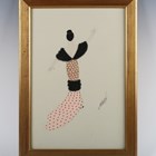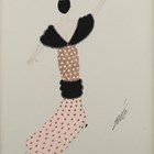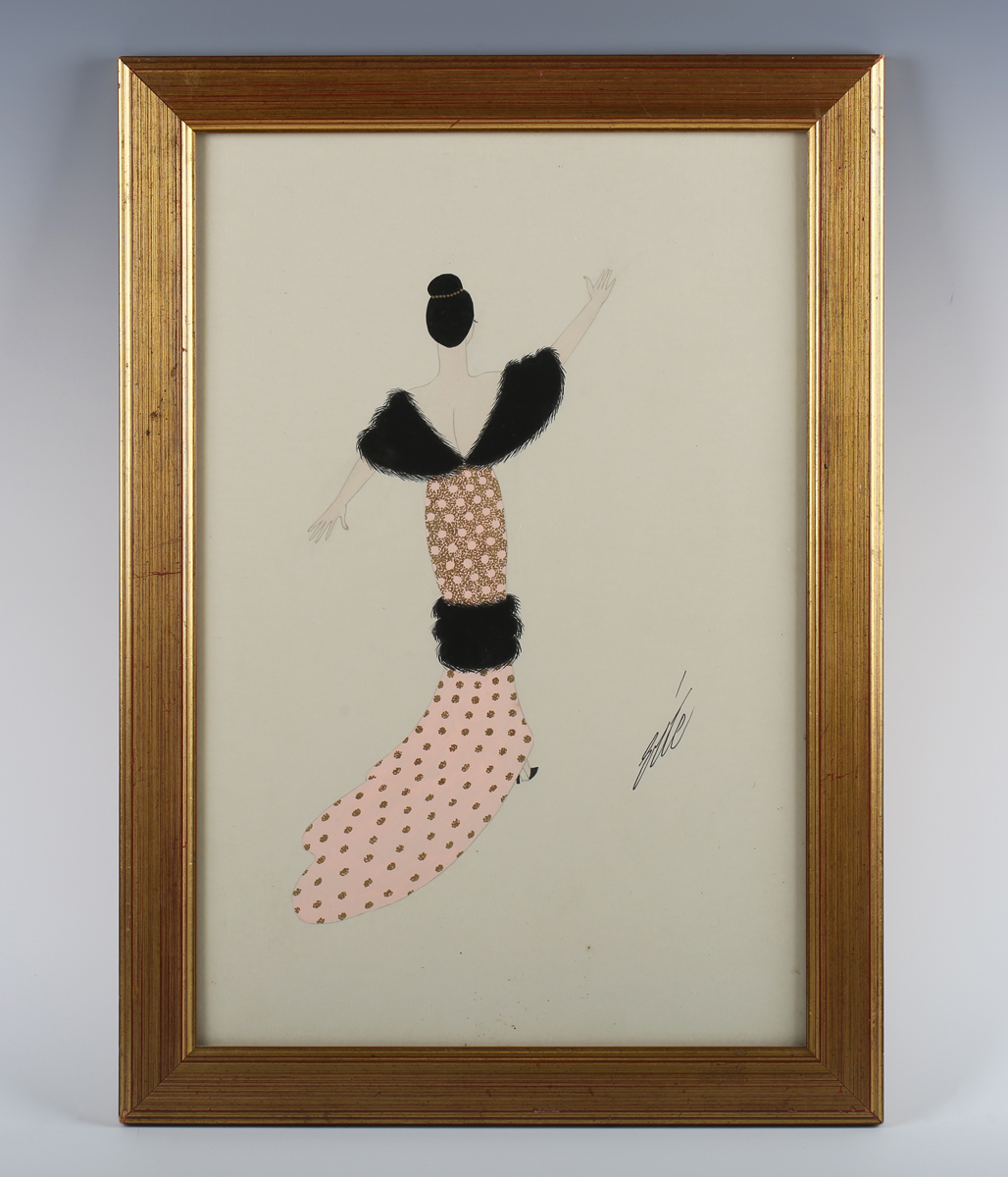 Erté (Romain de Tirtoff, Russian/French 1892-1990) - Rear view of a lady in a pink spotted gown with black fur trim and train, pen, ink and gouache, heightened with gold pen, signed lower right, 45cm x 30cm, within a gilt frame.