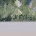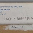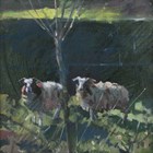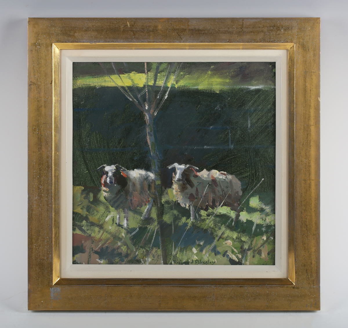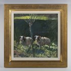 Richard Pikesley (British b.1951) - ‘Two Jacobs, Daffodil & Olga’: sheep in a landscape, oil on canvas, signed lower centre, 29cm x 29cm, within a gilt composition frame.