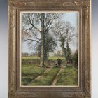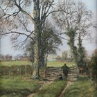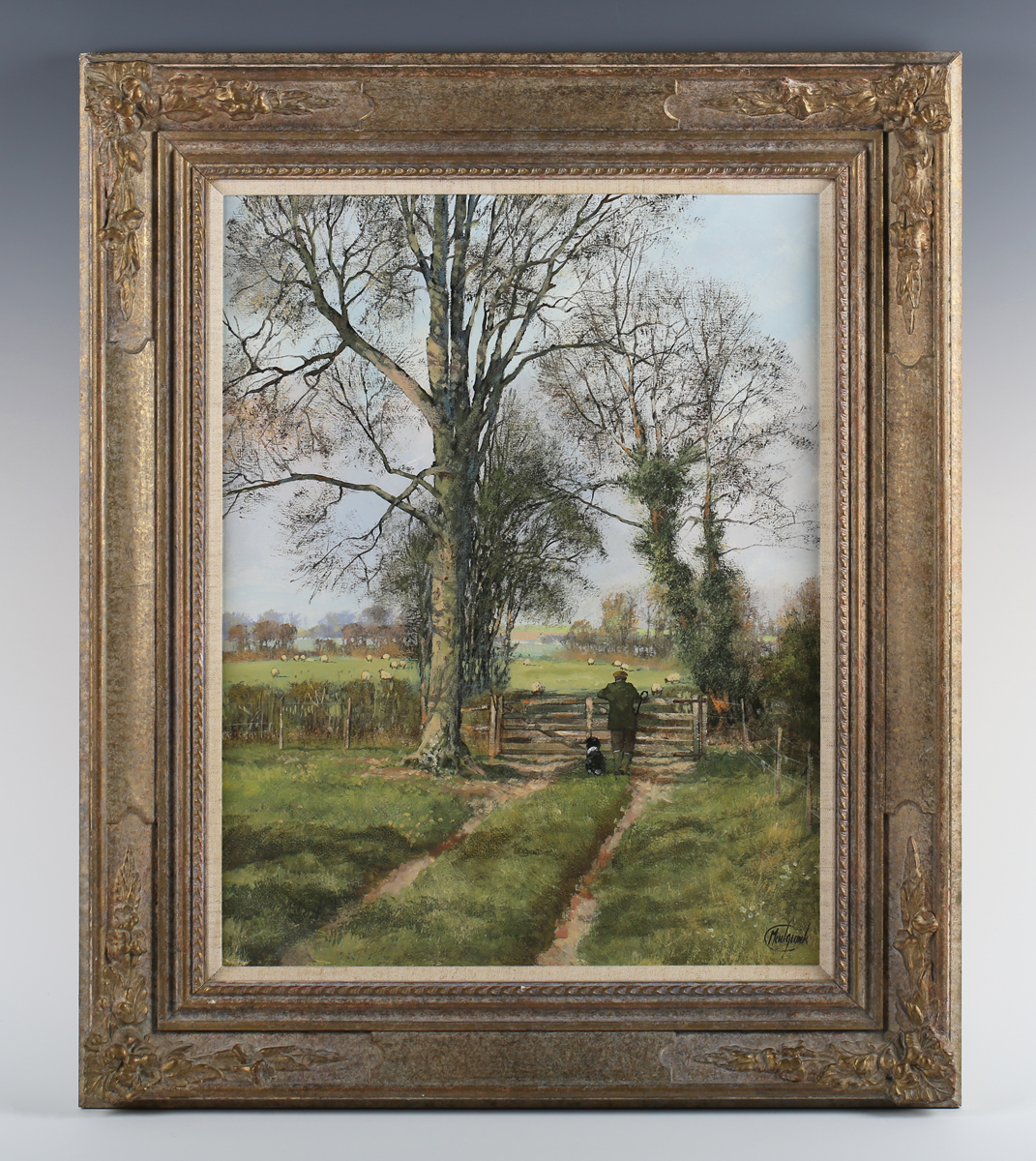 Clive Madgwick (British 1934-2005) - Man and his dog at a gate in a country landscape, oil on canvas, signed lower right, 46.5cm x 35.5cm, within a painted composition frame.