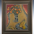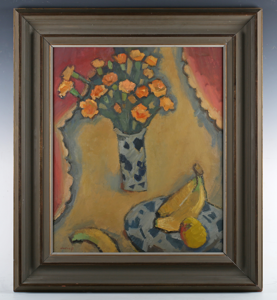 Denis Peploe (British 1914-1993) - ‘Flowers in a yellow vase’, oil on board, signed lower left, inscribed with title on label verso, 61cm x 50.5cm, within a painted frame.