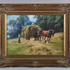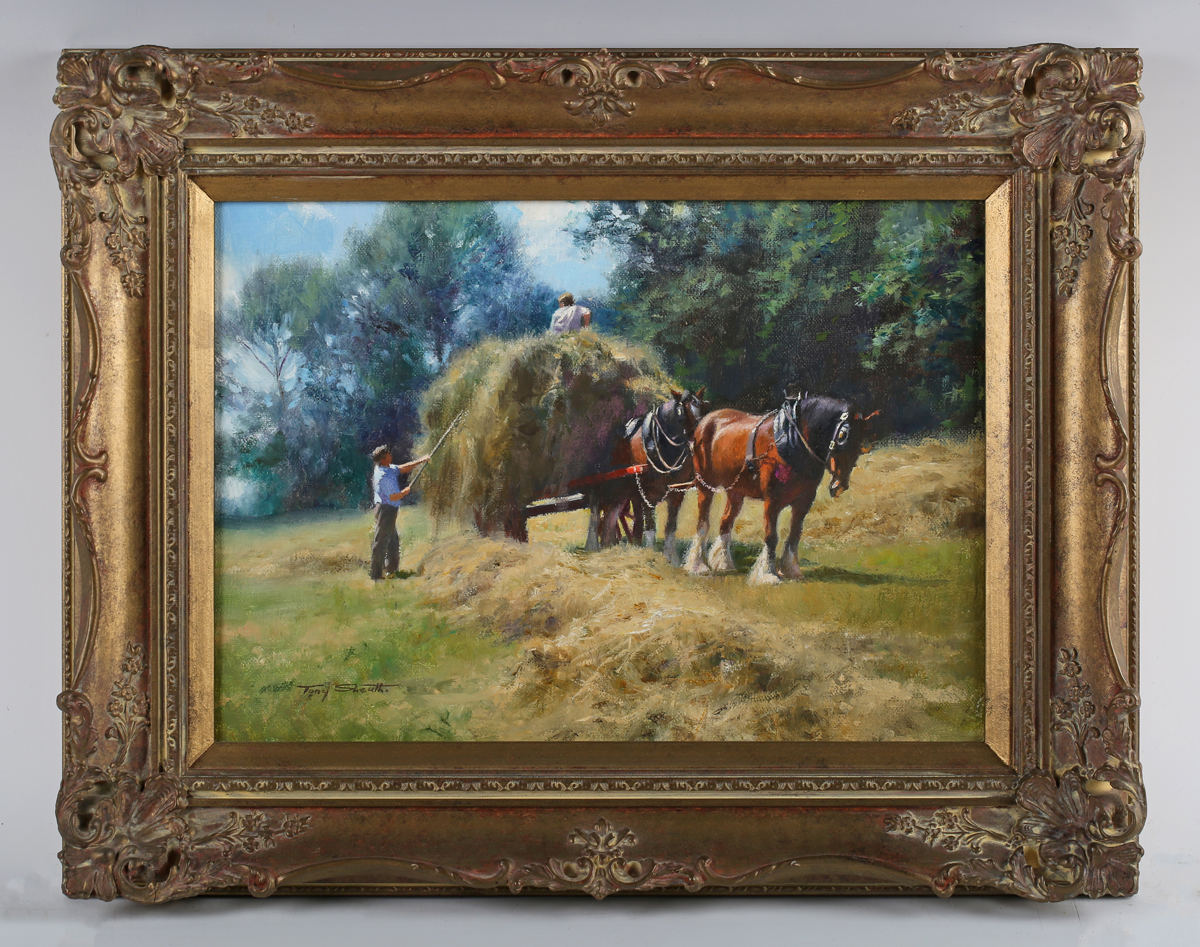 Tony Sheath (British b.1946) - ‘Hay Cart’, oil on canvas, signed lower left, 25cm x 35.5cm, within a swept gilt composition frame. Provenance: Stacy-Marks.
